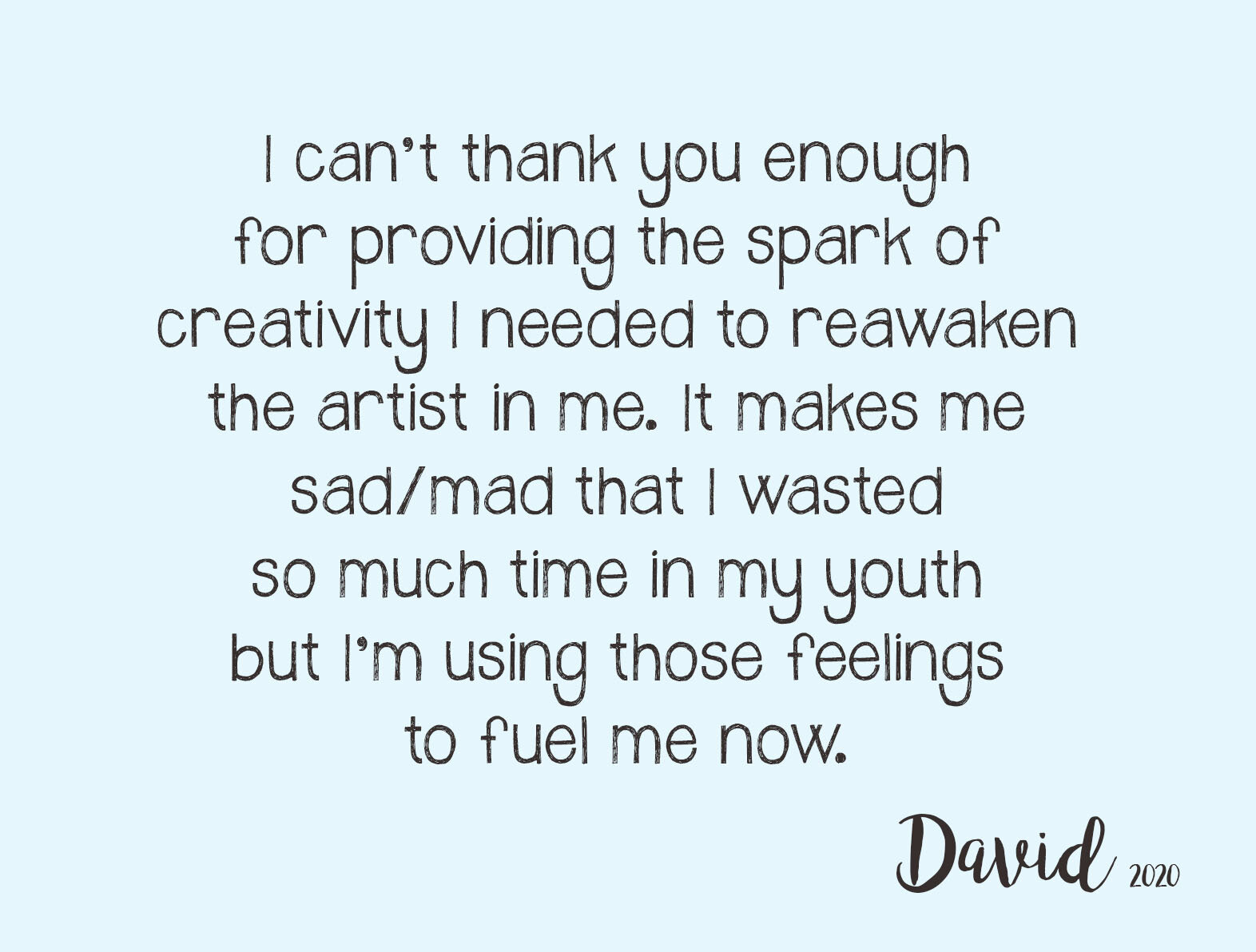 “You’re one of the most inspirational human beings I’ve ever met. I love how passionate you are about teaching/making art and I, one day, want to be as good of an artist as you. Thank you for being my inspiration. ”